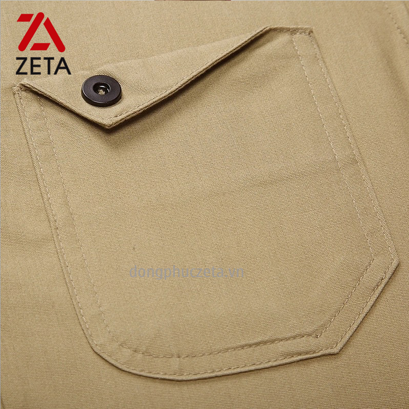 Đồng phục sơ mi nam cổ đức màu vàng bò dài tay, túi ốp cách điệu
