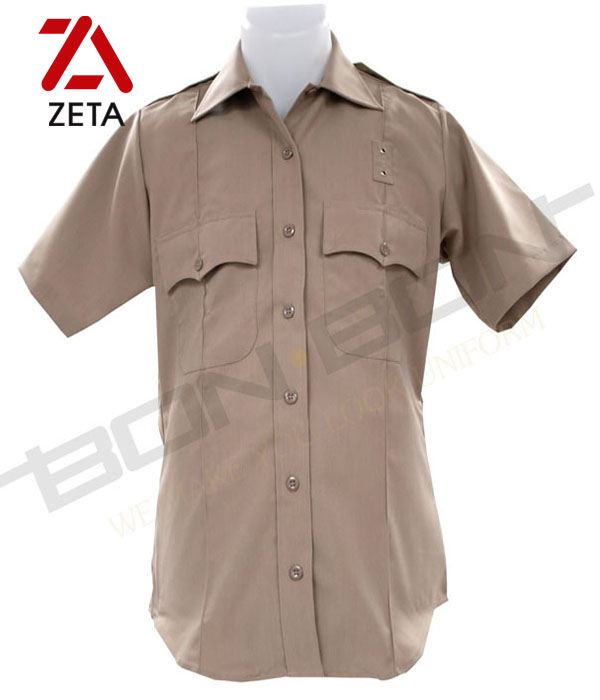 Áo bảo vệ đồng phục thường dùng là màu xanh da trời ngắn tay, cổ đức tạo nên dáng đứng cho áo, thắt cavat màu tím than, 2 túi ốp ngoài được thể hiện thân trước áo tạo lên dáng khỏe khoắn, Có thể phối một số chi tiết ở viền nổi túi để tạo lên sự khác biệt