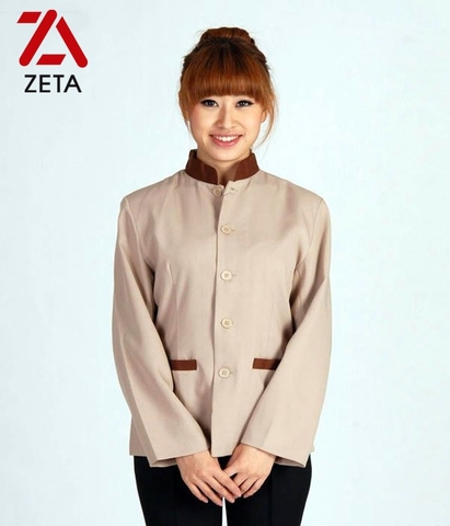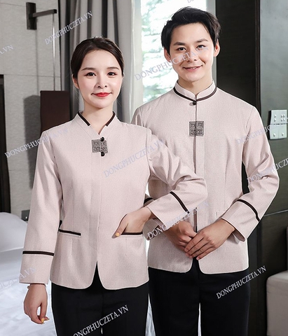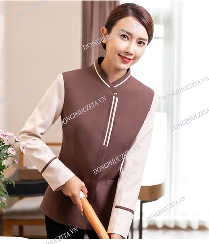 - Mẫu sản phẩm với cổ tàu phối lé viền màu nâu chải xuống một chút phần nẹp áo rất giản dị nhưng vẫn thể hiện sự năng động cho nhân viên buồng. Bên cạnh đó với việc bổ cơi 2 túi ở vùng hông sẽ rất tiện nghi cho nhân viên mang theo sổ sách và để vào phục vụ cho công việc.