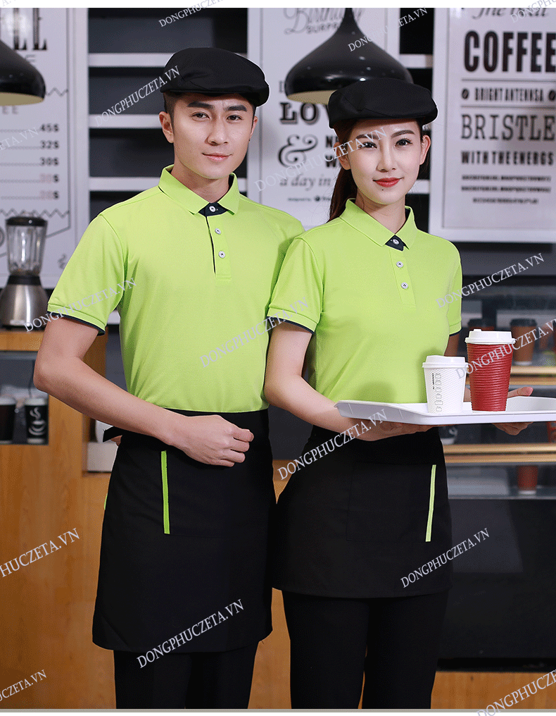 Áo kết hợp với tạp dề ngang eo màu đen, điểm nhấn của tạp dề quán cafe nằm ở phần túi, lần này chúng tôi biến tấu phần phối xanh dọc túi tạo thành một đường thẳng cá tính. Set đồng phục còn được tô điểm thêm bởi chiếc mũ nồi màu đen tạo nên hình ảnh hết sức chuyên nghiệp cho nhân viên nữ quán cafe.