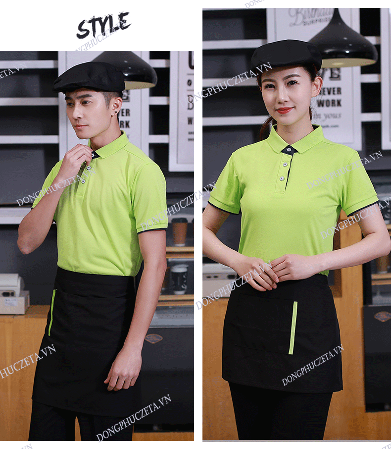 Với thiết kế đơn giản nhưng vẫn cho nhân viên phục vụ sự sang trọng lịch sự. Đó chính là mục tiêu của áo phông đồng phục cafe màu xanh nõn chuối cộc tay này. Bộ đồng phục dành cho nhân viên nam, nữ phục vụ quán cafe gồm: Áo phông cộc tay có cổ, với chân cổ và phần nẹp khuy phối xanh tím than làm điểm nhấn.
