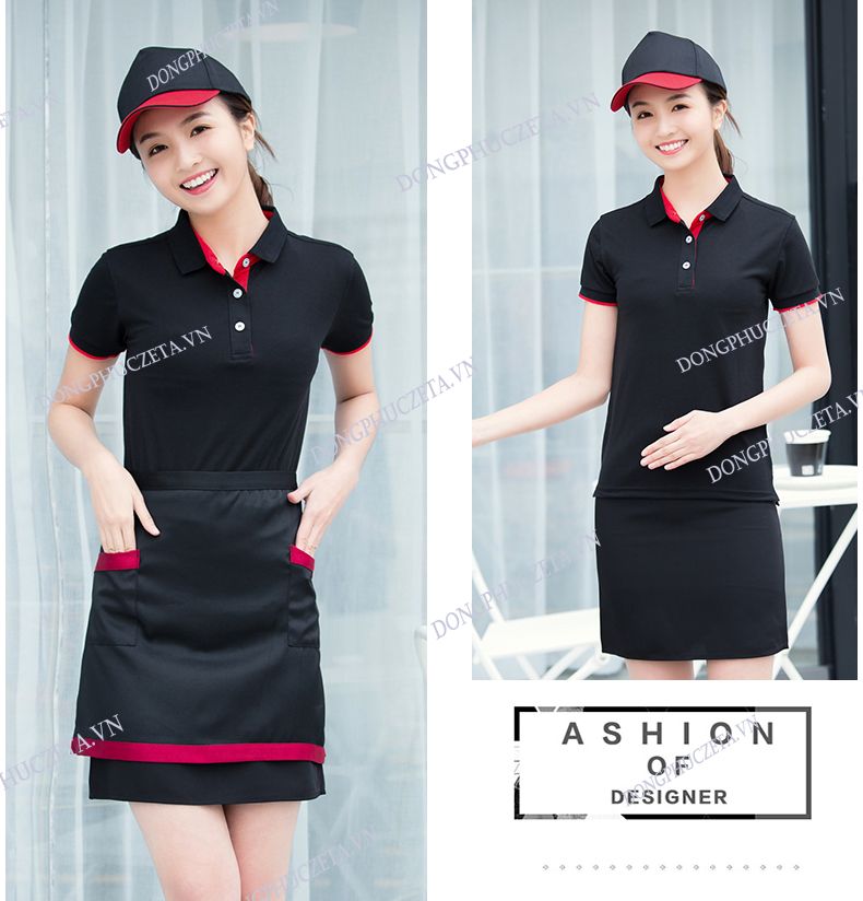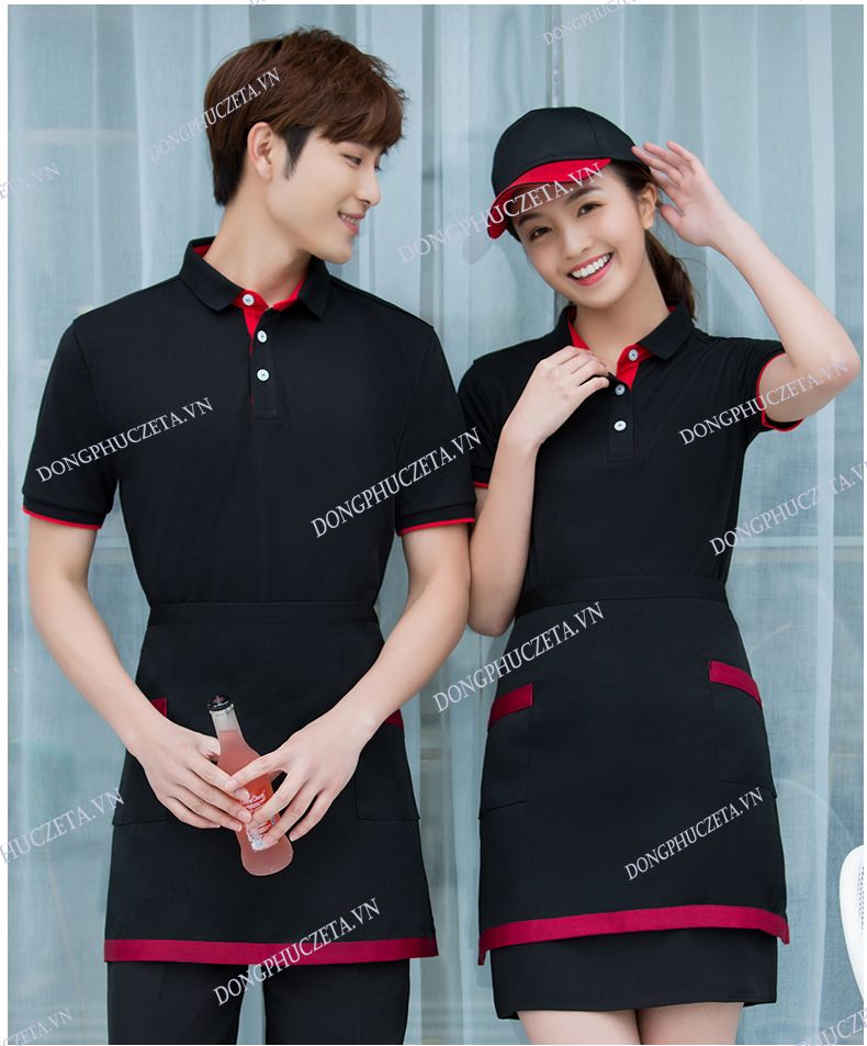 Với thiết kế đơn giản nhưng vẫn cho nhân viên phục vụ sự sang trọng lịch sự. Đó chính là mục tiêu của mẫu áo phông đồng phục cafe màu đen này. Bộ đồng phục dành cho nhân viên nam, nữ phục vụ quán cafe gồm: Áo phông cộc tay có cổ, với chân cổ và phần nẹp khuy phối đỏ làm điểm nhấn.