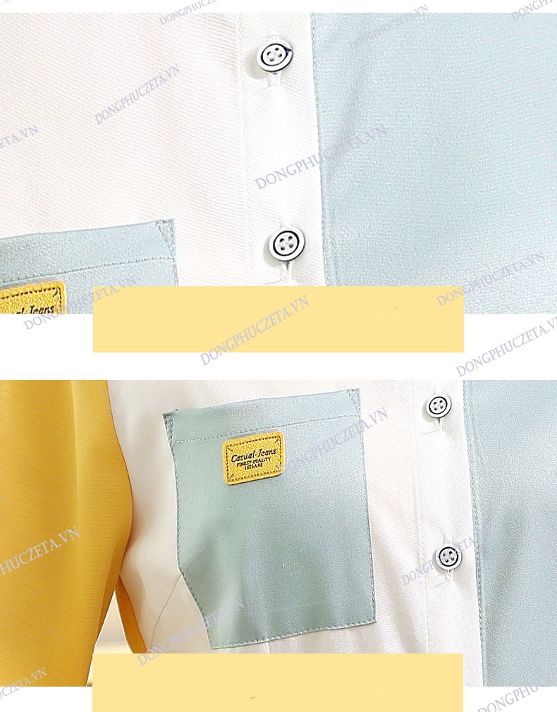 Áo với dáng sơ mi slimfit rất trẻ trung, mầu sắc được pha phối hài hòa với các tông màu nổi bật như vàng, trắng và màu xanh dịu nhẹ