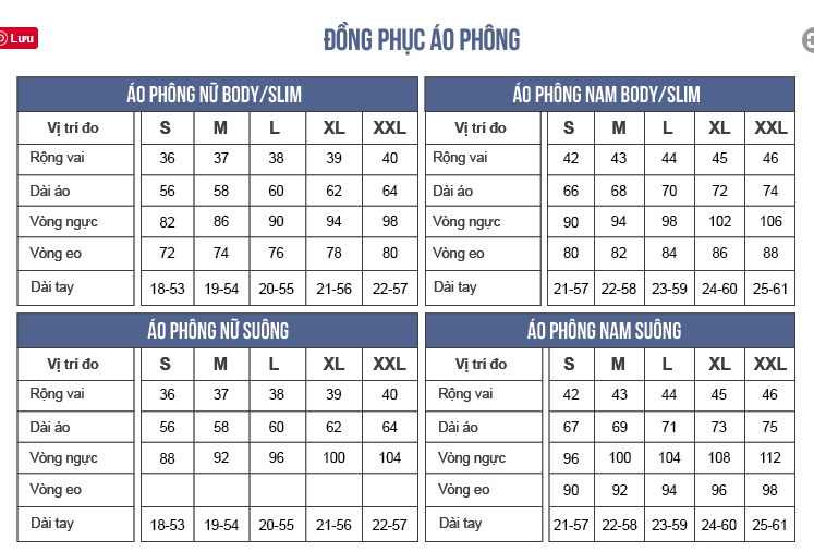 Hầu hết các công ty may đồng phục hiện nay đều sử dụng bảng size áo đồng phục bao gồm nhiều thông số như: cân nặng, chiều cao tương ứng với các size S, M, L, XL .... phân chia giới tính nam nữ và trẻ em.