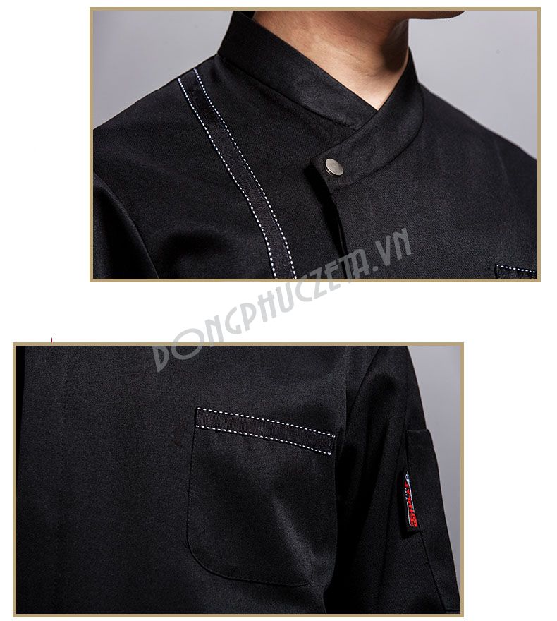 mẫu đồng phục làm bếp với thiết kế cổ tàu bản 3cm màu đen khít cổ. Kiểu ài giấu khuy chỉ để một khuy duy nhất tạo nét đẹp đặc sắc cho mẫu thiết kế này. Ngoài ra sản phẩm còn mang tính chất giản dị nhưng vẫn có nét ấn tượng đặc sắc dành riêng cho người đầu bếp đó là các đường line nhấn màu trắng từ dọc vai xuống hết gấu áo và ở phần túi ngực của sản phẩm