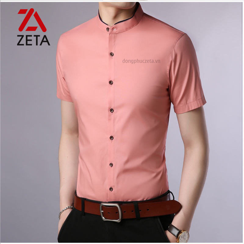 Sơ mi nam công sở cổ tàu (cổ trụ) màu hồng cam, cổ áo phối lé đường viền màu, dáng ôm vừa vặn tạo phong thái lịch lãm Các mẫu áo sơ mi nam đẹp và hợp thời trang từ đồng phục Zeta Miền Bắc tôn vinh vẻ lịch lãm và nam tính. Với chất liệu và màu sắc đa...