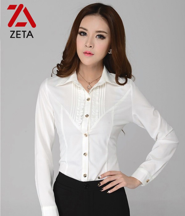 Đồng phục áo sơ mi nữ công sở được thiết kế kiểu cổ đức, cổ tàu, cổ sen mới mẻ làm tôn lên chiếc cổ cao của phụ nữ.
