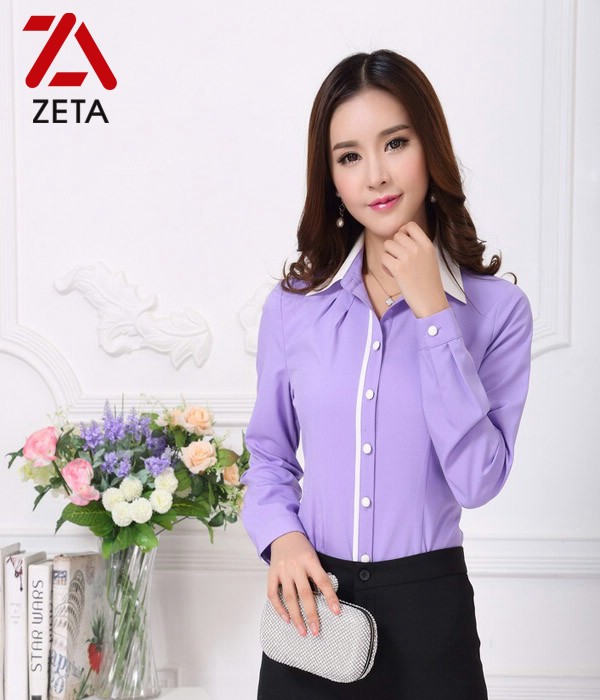 Đồng phục áo sơ mi nữ công sở được thiết kế kiểu cổ đức, cổ tàu, cổ sen mới mẻ làm tôn lên chiếc cổ cao của phụ nữ.
