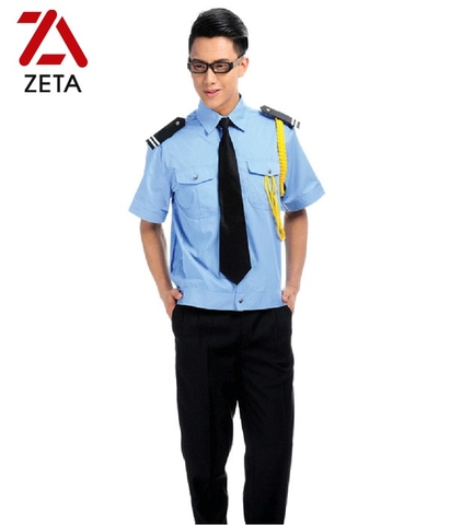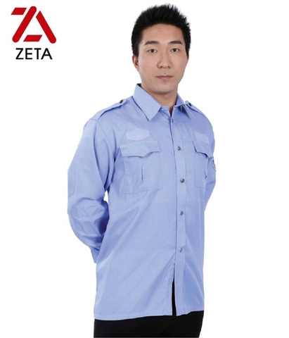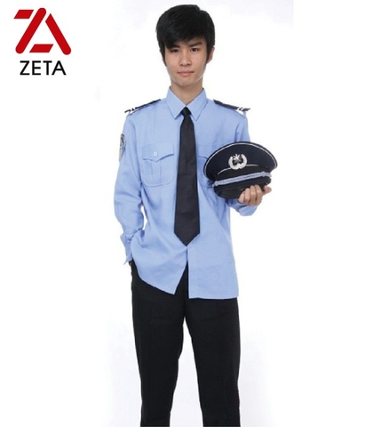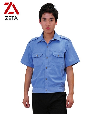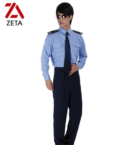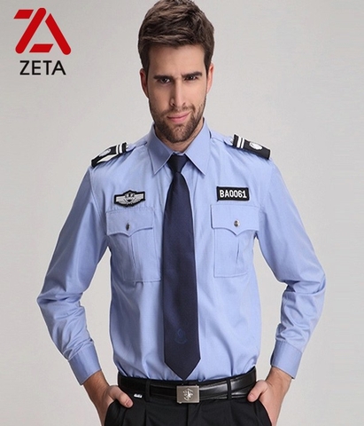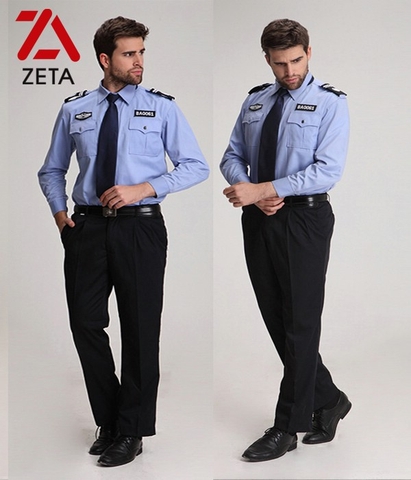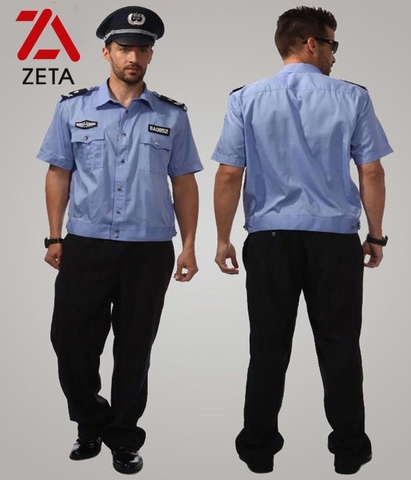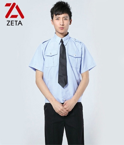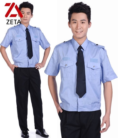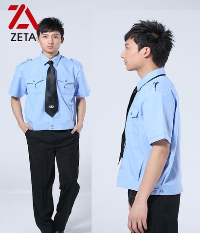 Áo bảo vệ đồng phục thường dùng là màu xanh da trời ngắn tay, cổ đức tạo nên dáng đứng cho áo, thắt cavat màu tím than, 2 túi ốp ngoài được thể hiện thân trước áo tạo lên dáng khỏe khoắn, Có thể phối một số chi tiết ở viền nổi túi để tạo lên sự khác biệt