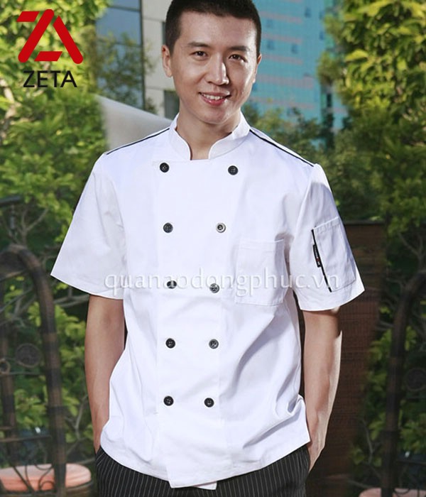 - Cổ áo được may theo dáng cổ tàu, cùng hai hàng khuy chéo ấn tượng, thêm vào đó có thể là chiếc túi cơi có phối ngực viền đỏ tạo lên điểm nhấn đặc trưng cho chiếc áo đồng phục bếp