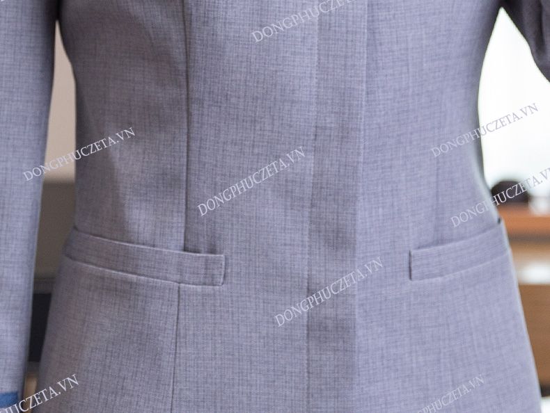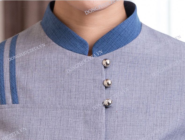 Mẫu đồng phục nhân viên buồng phòng này là sự pha phối hài hòa giữa ánh xanh da trời với màu ghi sáng. Áo với thiết kế cổ tàu, nẹp giấu khuy dài tay thích hợp cho nhân viên vào màu thu đông. Dáng áo hơi ôm điểm nhấn của áo nằm ở các nét pha phối trang nhã với 3 vạch từ vai xuống ngang ngực. Đường phối tay màu ghi sáng kết hợp màu xanh làm cho áo thêm nét đẹp khó cưỡng lại