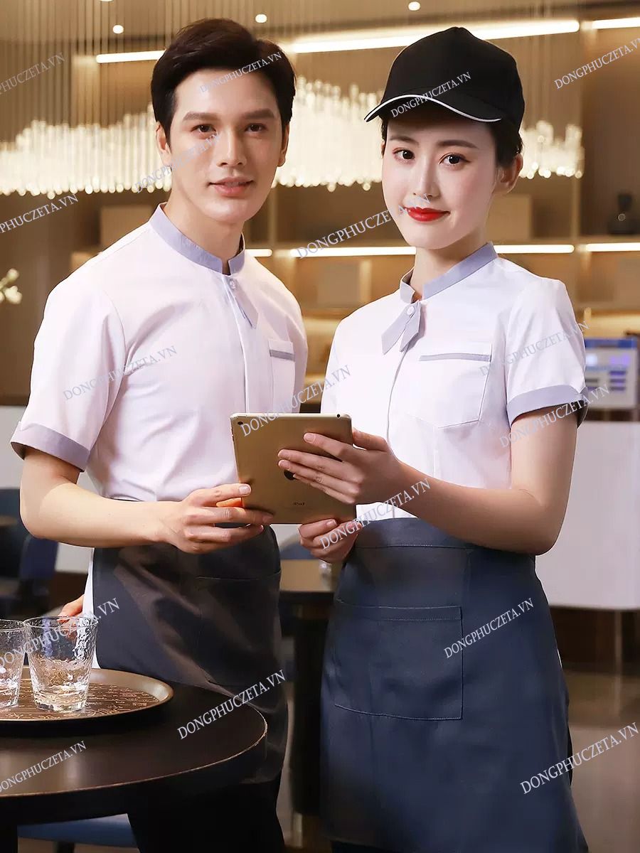 Vẫn là kiểu dáng sơ mi lịch sự cổ tàu phối màu ghi, với tông chủ đạo là màu trắng lịch sự sạch sẽ! áo với dáng slimfit hợp thời trang. Điểm nhấn của mẫu nằm ở nơ cổ màu ghi cùng phần tạp dề nửa thân! sản phẩm rất thích hợp dùng cho nhân viên phục vụ bàn quán cafe, quán trà sữa, tiệm bánh, quán lẩu nướng BBQ mang phong cách Hàn Quốc