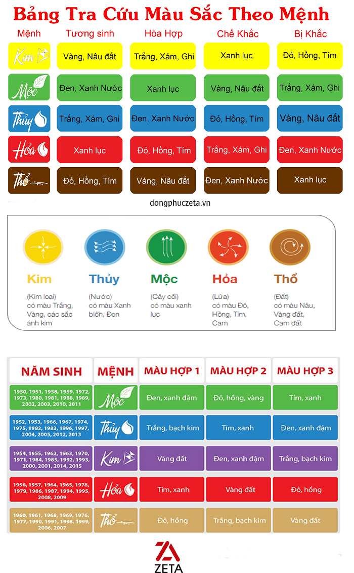 Đồng phục Zeta Miền Bắc xin gửi tới bảng tra cứu màu sắc hợp mệnh theo ngũ hành, từ đó bạn có thể dễ dàng lựa chọn trang phục nhân viên phục vụ nhà hàng, cũng như màu sắc chủ đạo trong thiết kế nhà hàng của mình.