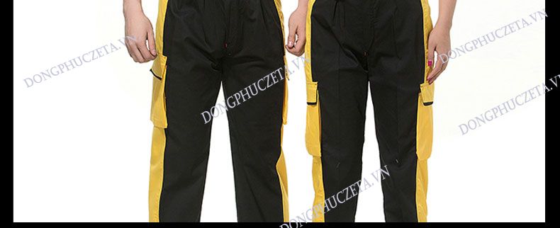 Với chất liệu vải kaki pangrim thoáng mát mặt vải bền, dễ dàng giặt tẩy các vết bẩn dầu mỡ. Quần áo được chúng tôi thiết kế phối bổ mảnh đặc sắc áo đen phối vàng.